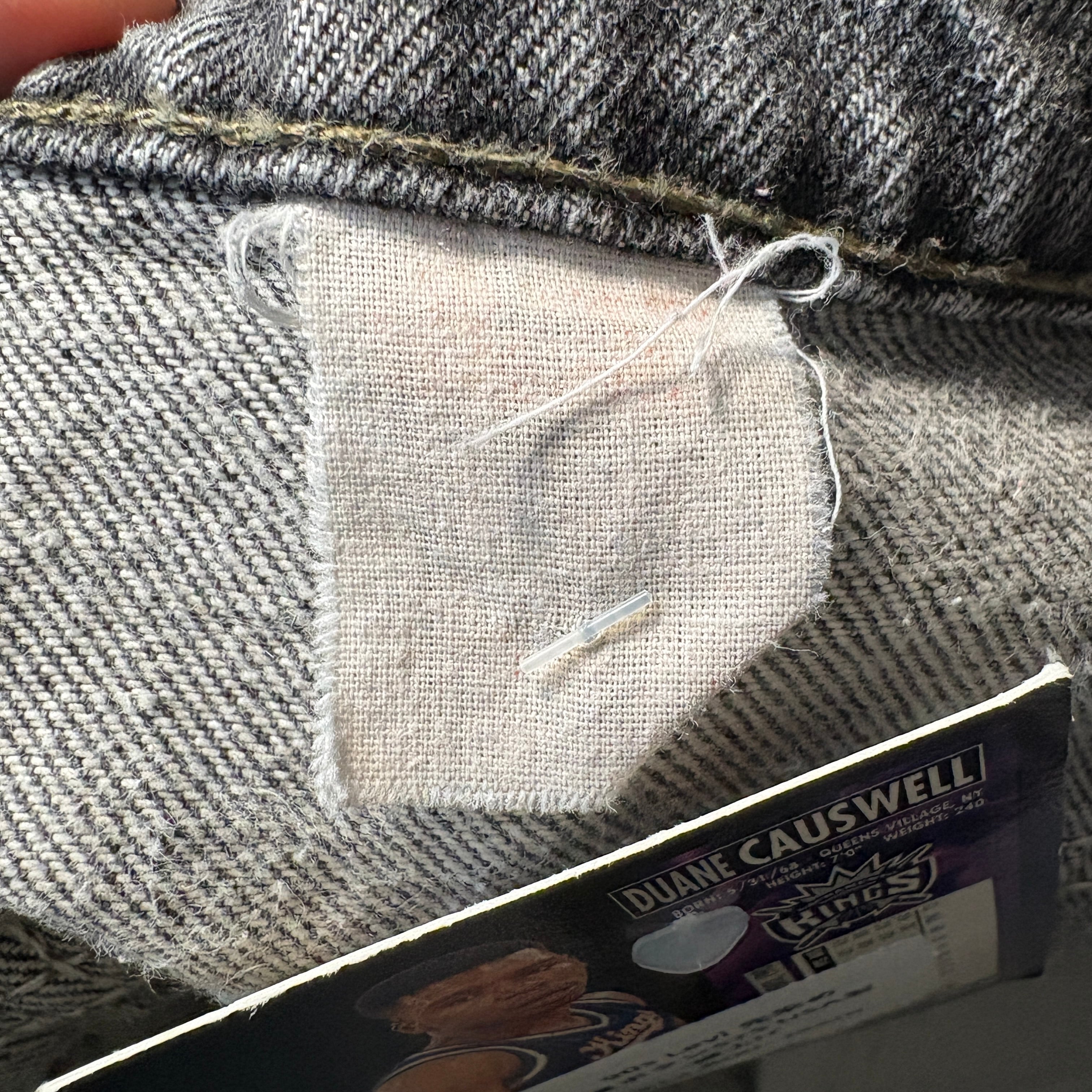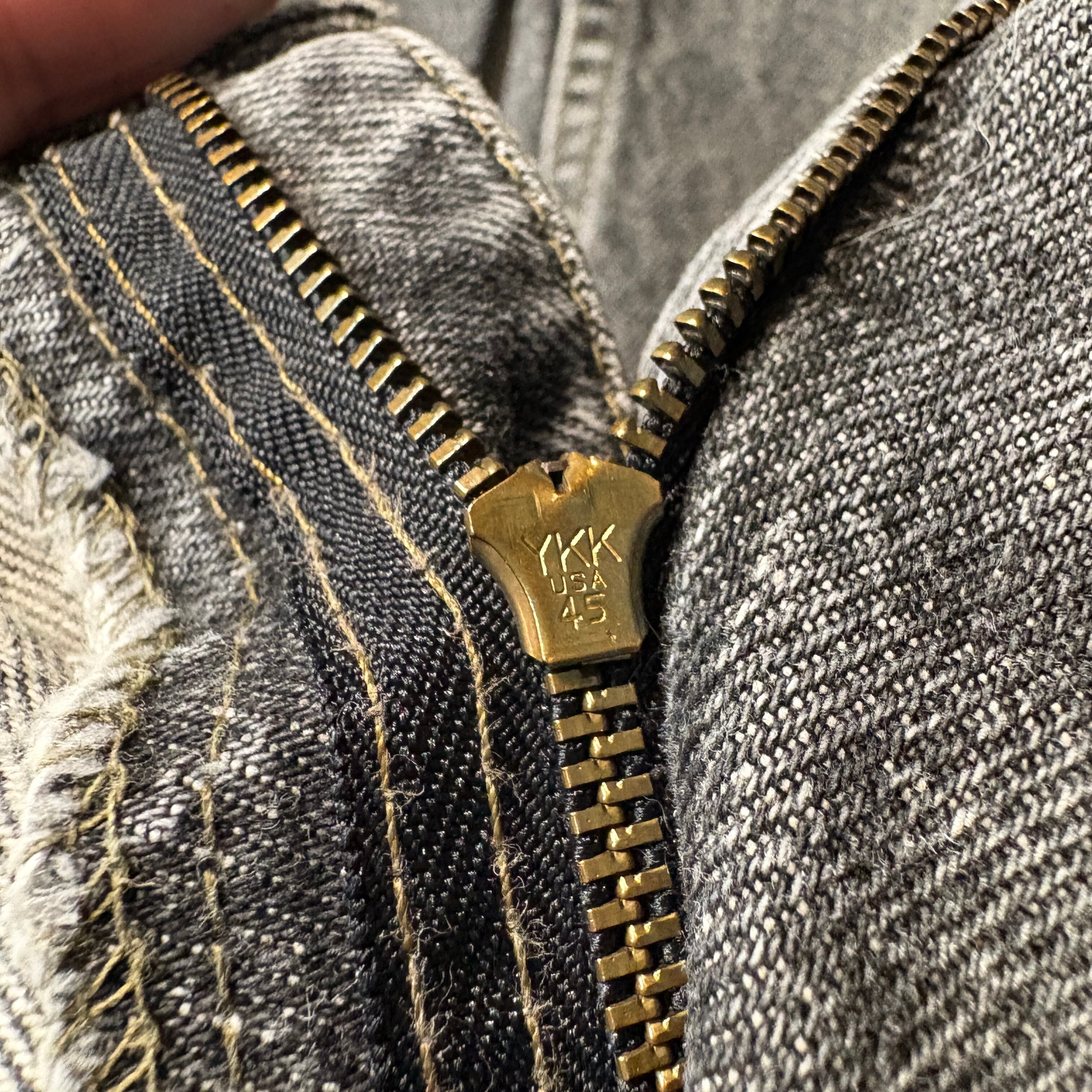 最大の特徴は、市場であまり見かけない「先染め」の生地が使用されている点です。通常のインディゴデニムとは異なり、糸の段階で染められているため、奥行きのある均一な色合い(もしブラック系であれば深いブラック)が楽しめます。この年代のUSA製、さらに先染めという条件が揃うアイテムは非常に少なく、希少価値の高いコレクターズアイテムです。