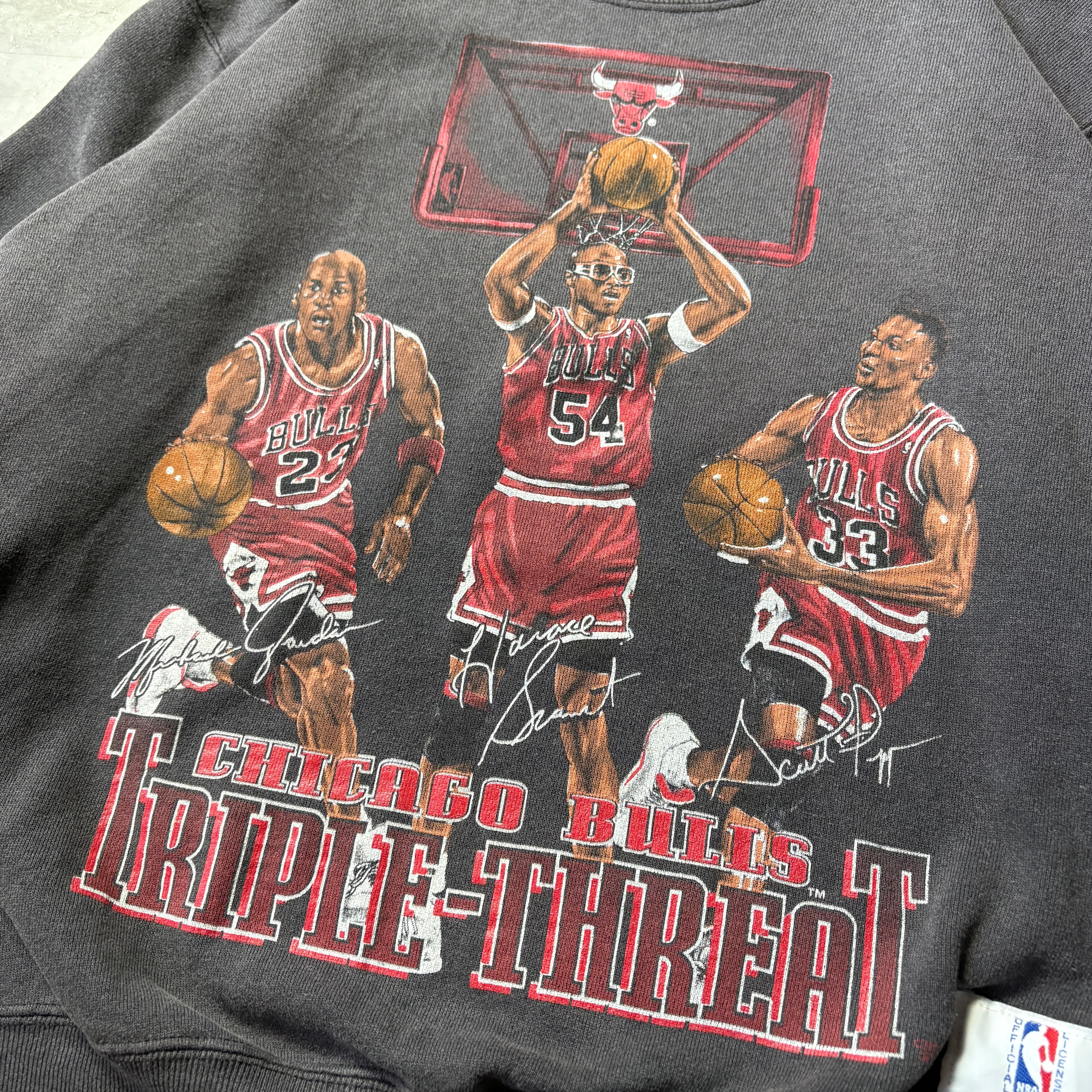 このスウェットシャツは、マイケル・ジョーダン率いるシカゴ・ブルズがNBAで圧倒的な強さを誇り、1991年から1993年にかけて最初の3連覇(スリーピート)を達成した「黄金時代」の背景を持っています。当時のNBA公式アパレルは、スポーツファンだけでなく、ファッションアイテムとしても世界中で愛用されました。
