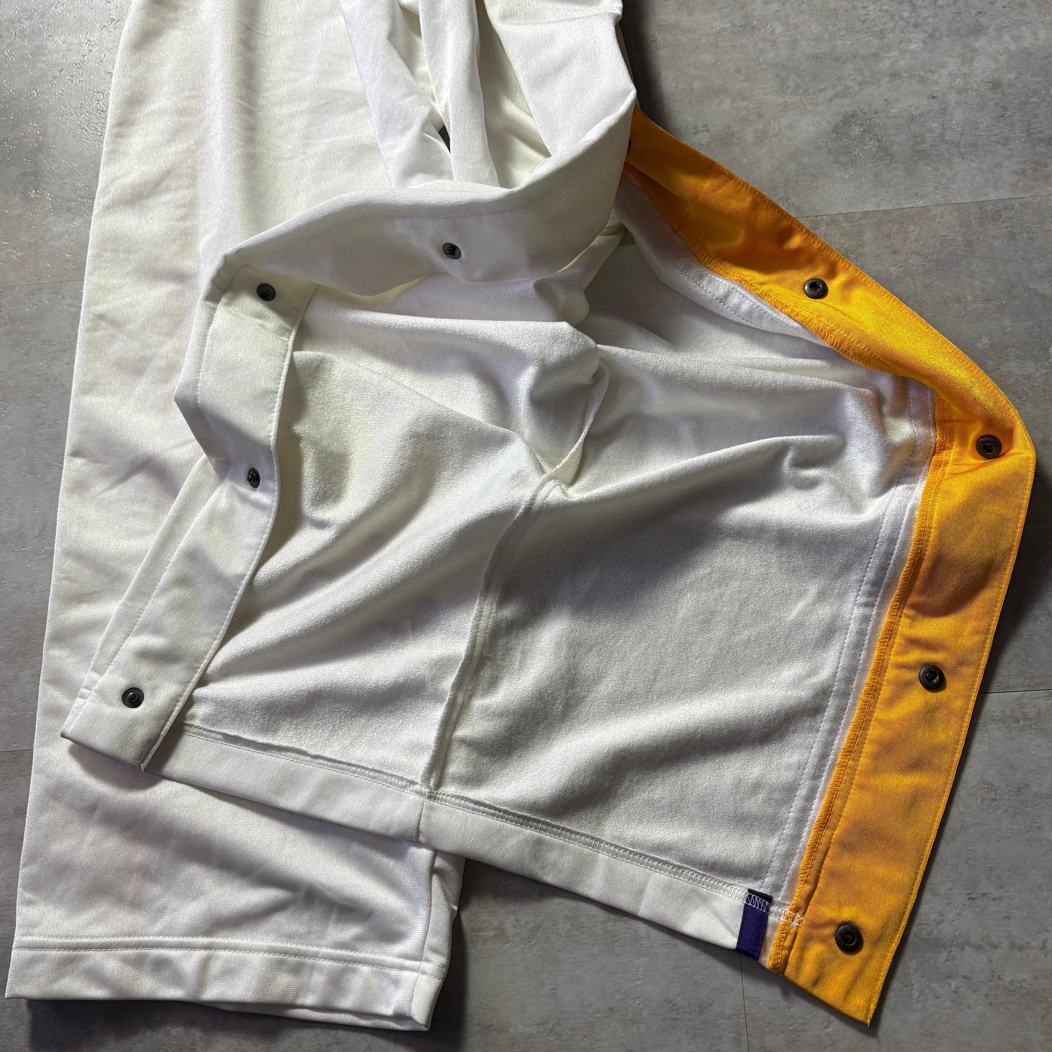カルチャー的背景: 1990年代後半から2000年代初頭にかけて、NBAは世界的な人気を博しており、特にレイカーズの紫と黄色のアイテムは、ヒップホップやストリートファッションシーンでアイコン的な存在でした。このスーツは、その時代の空気感を色濃く反映した、ファン垂涎のコレクターズアイテムとなっています。