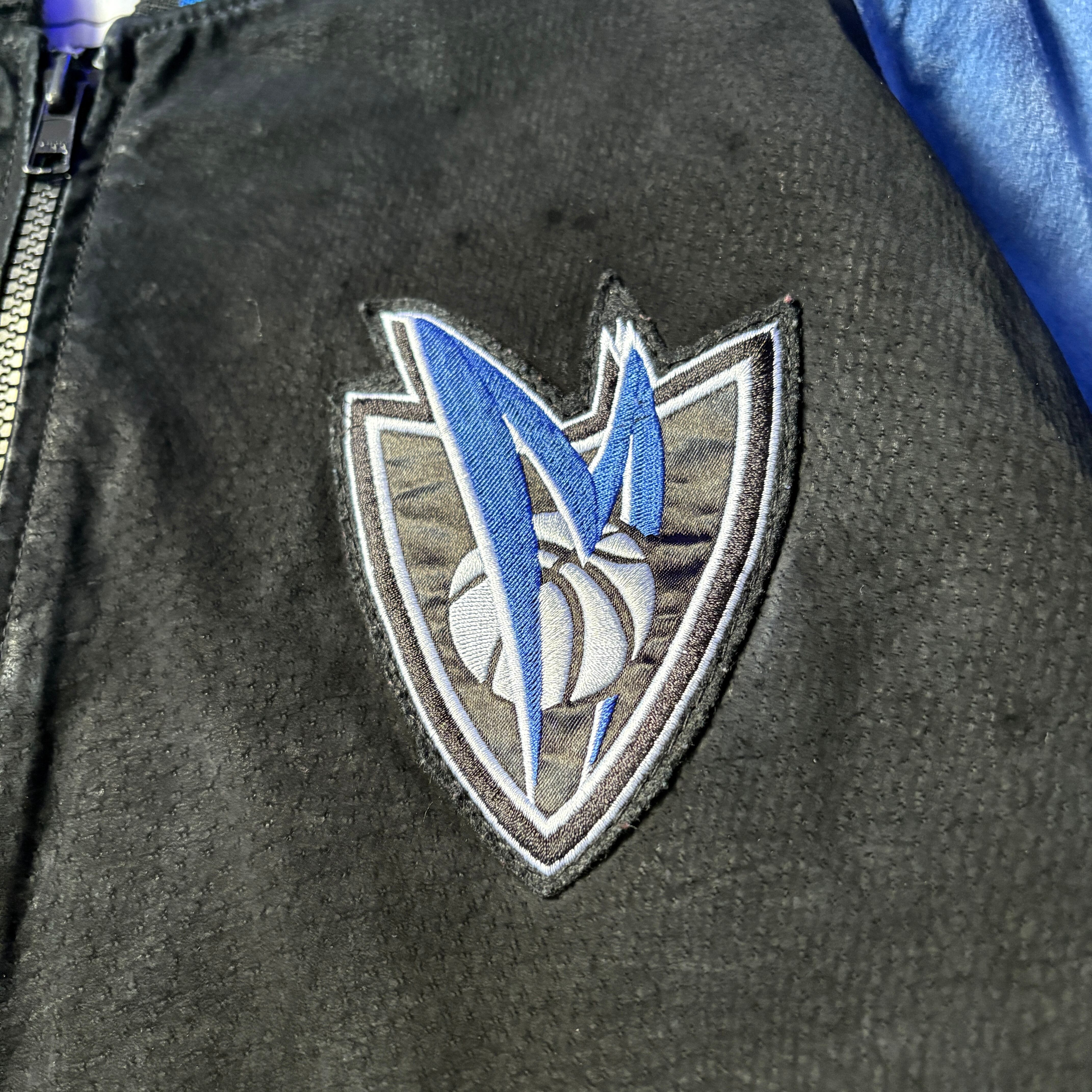 商品のロゴは、ダラス・マーベリックスが2001年から2017年まで使用していた馬の頭部をモチーフにしたモダンなデザインです。G-III社は1990年代にNBAを含む主要なスポーツリーグのライセンスを取得しているため、このジャケットの製造時期は2001年〜2010年代中期と考えられます。
