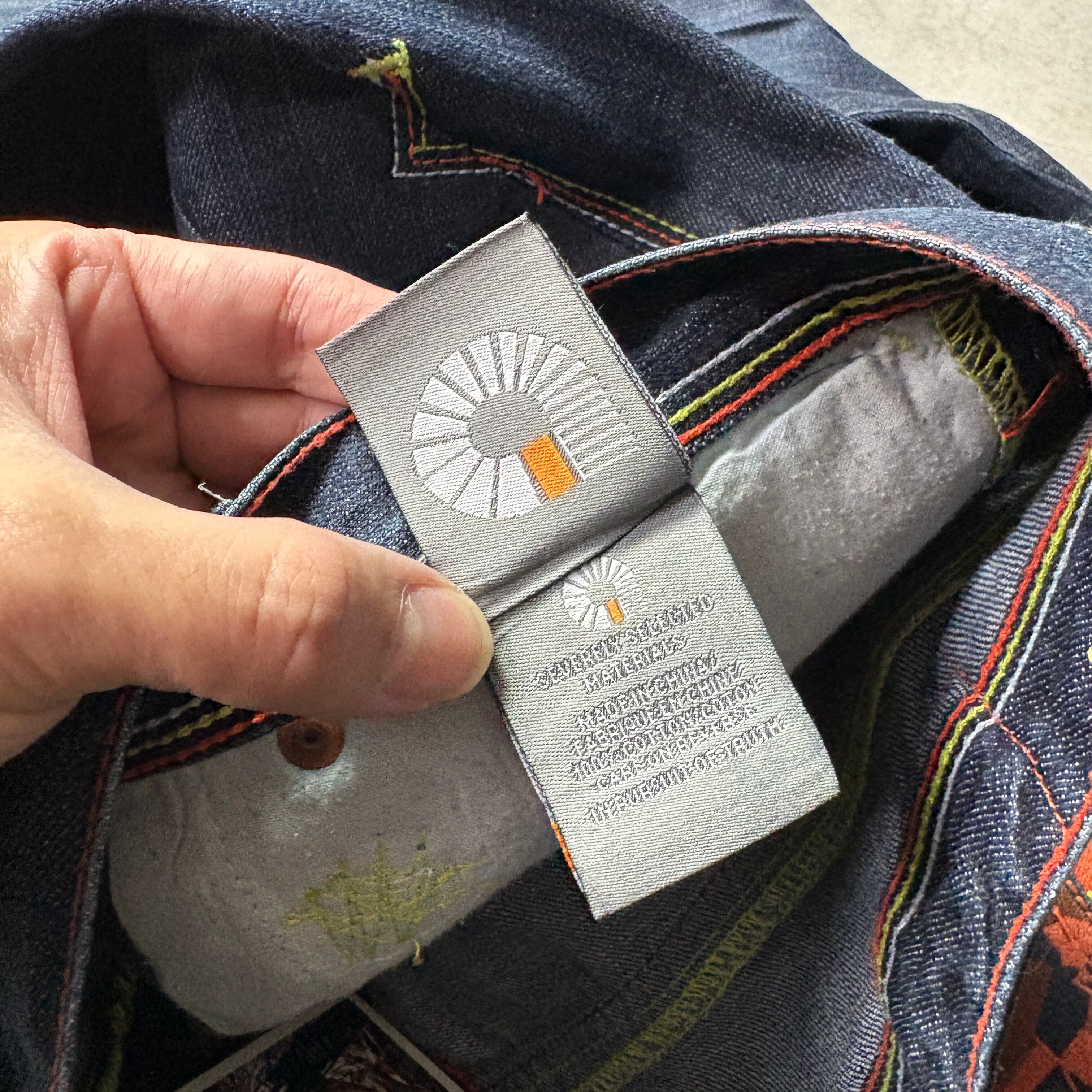 目を引くバックポケットの大胆な刺繍とグラフィックプリントが最大の特徴。