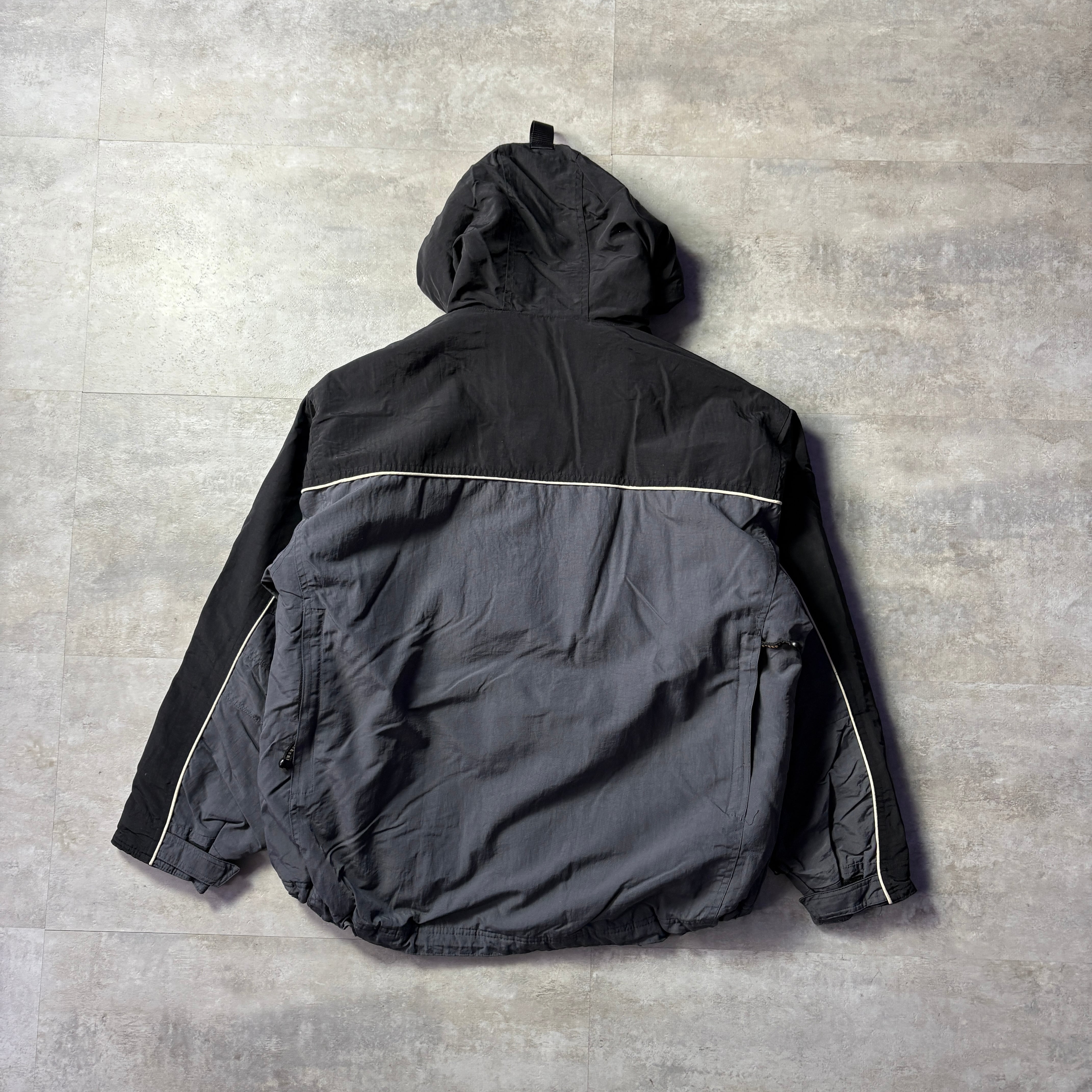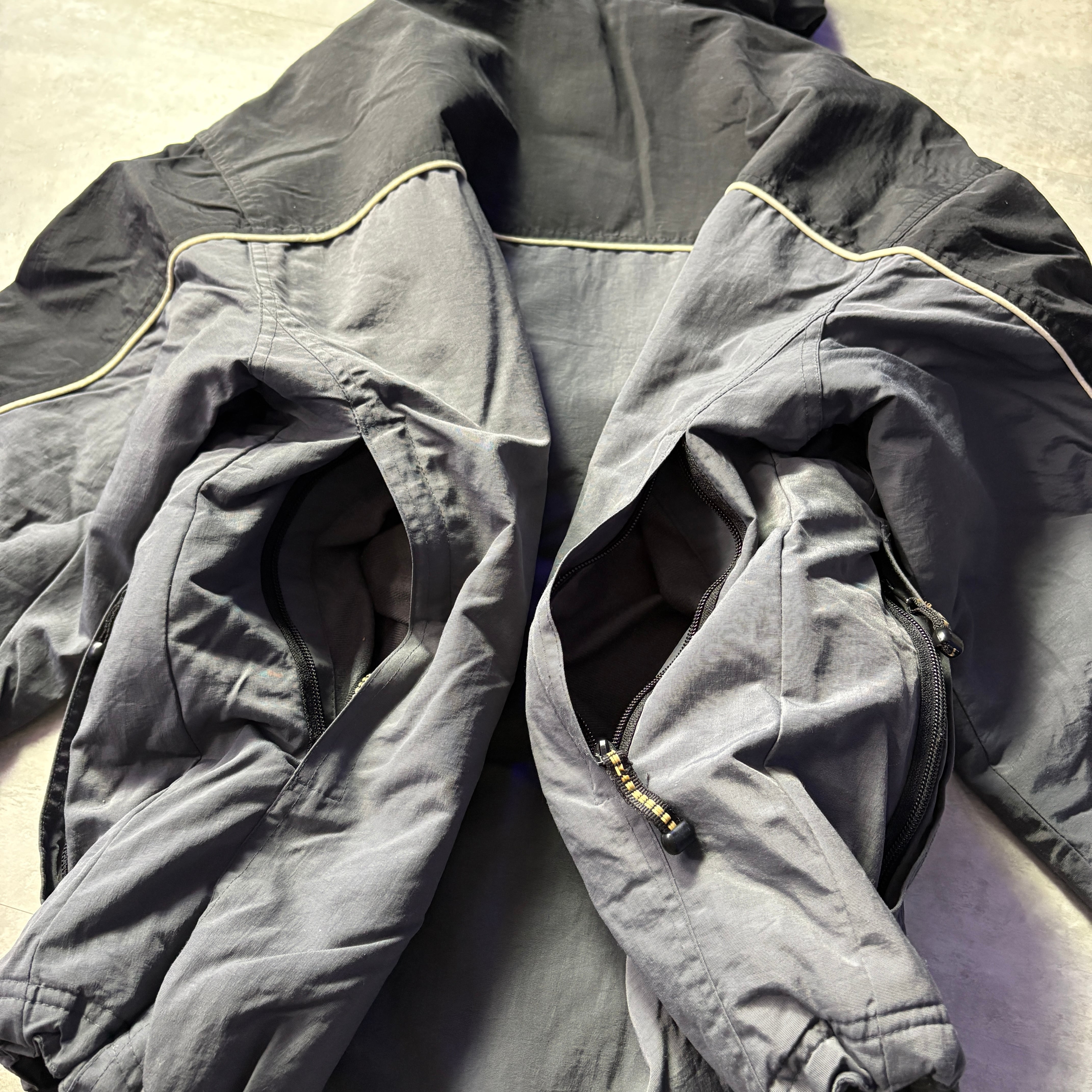 ダブルジップ、裾ドローコード、袖のマジックテープなど、気の利いた仕様が満載で、リップストップのナイロン生地である可能性が高いです。