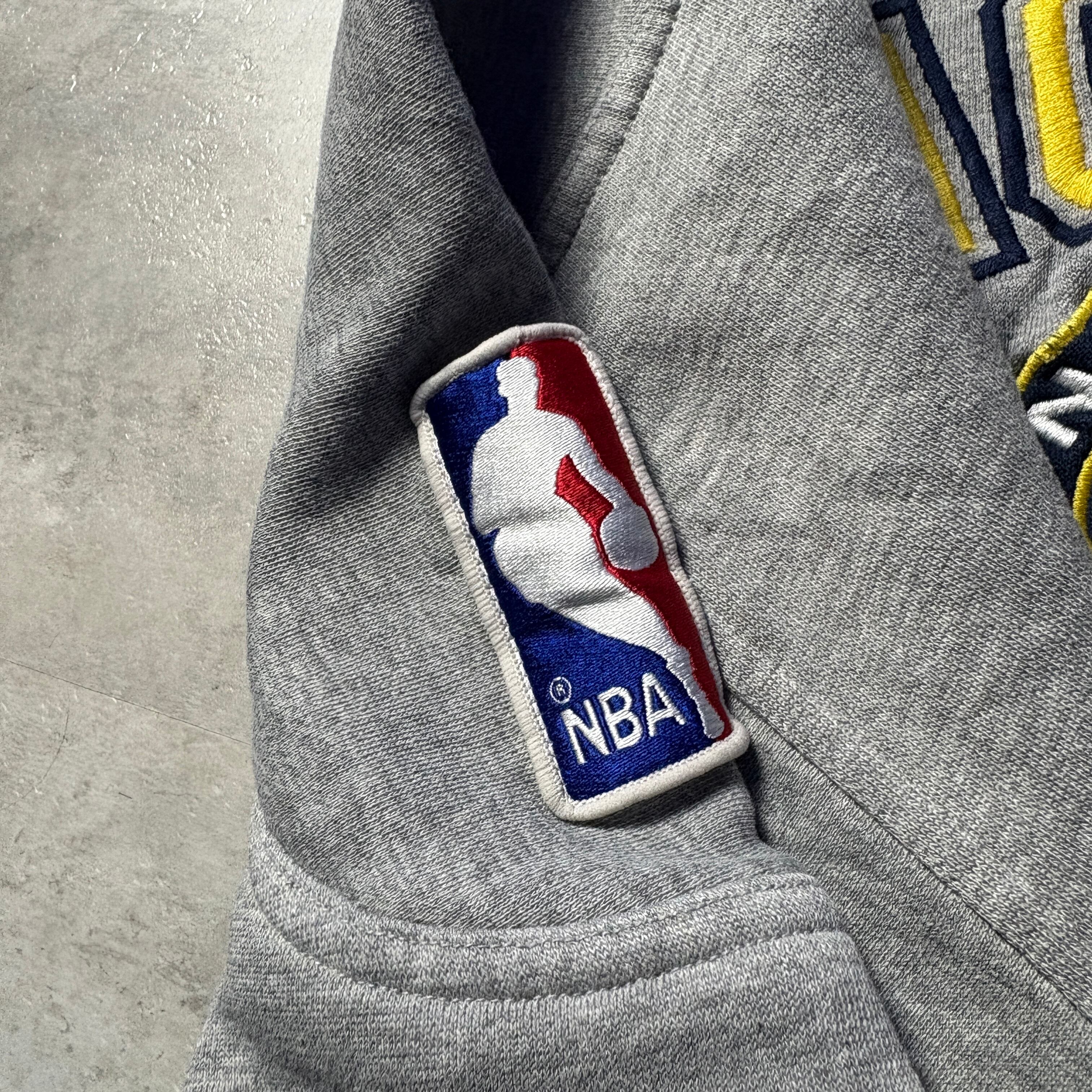 カルチャー的背景: 90年代のNBAブームは日本でも凄まじく、こうしたチームロゴ入りのスウェットは「アメカジ」や「B-BOY」スタイルのマストアイテムでした。特にペイサーズのイエロー×ネイビーの配色(このアイテムでは刺繍に使用)は、当時のスポーツファッションにおいて非常に人気の高いカラーリングでした。